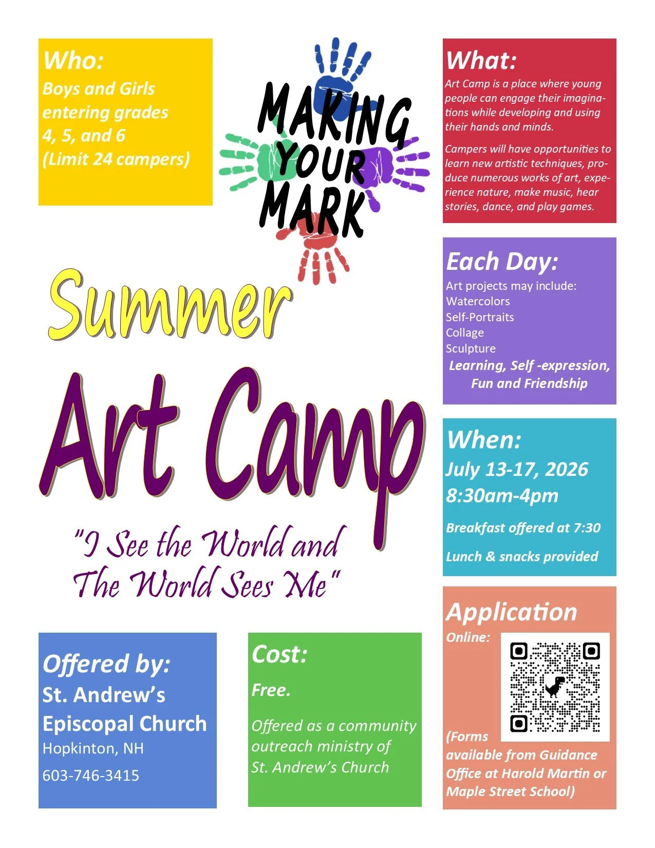 For a hot July week every summer over since 2013, a dedicated group of parishioners has opened the doors of St. Andrew’s to Making Your Mark Art Camp. Meeting an acknowledged community need, Making Your Mark offers five full days of wide-ranging creative activities to up to 24 local children, many of whose families cannot afford the enrichment activities their peers often take for granted.