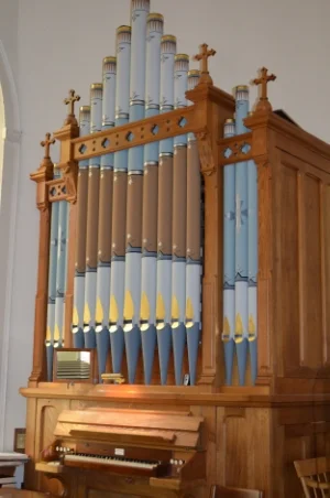 St. Andrews has the privilege of not one, but two historic tracker organs. The instrument on the floor is an E. & G.G. Hook & Hastings, Opus 714, built 1873 and installed in 1874. While small, with only one manual and a straight pedal board, it is tonally vibrant and can lead the worship with everything from the gentle 8' Stopped Diapason to the brilliant Sesquialtera. Over the years it has undergone many renovations, including the restoration of its golden oak case and stenciled front pipes, the replacement of its original hand pump wind supply with an electric system, and tonal revisions. In the early 1970's, many pipes were replaced with new ranks purchased from Anderson of Brattleboro and Kaes of West Germany, for the purpose of "finer tone, greater versatility, better clarity, and more brilliance." The pedals were recapped with teak and hard maple, and the instrument was tuned in a meantone temperament. A celebratory concert was held in December, with Mr. John Skelton presenting works of Swellinck, Frescobaldi, Bach, Purcell and others. Extensive cleaning and restoration work was done in 1999 by Andover Organ Company. At this time a proposal was made to add a second manual to the instrument, which would include a Dulciana and a Principal stop, among others. A more moderate proposal was accepted which included stripping the case, which was then painted, and restoring its natural finish, re-stenciling the facade pipes, and releathering the reservoir.