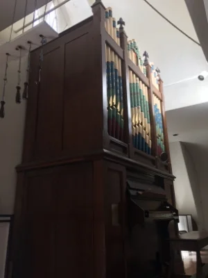 In the balcony is another tracker organ, a Henry Erben, which has been disassembled and moved numerous times during its long lifetime. It was lifted into the balcony by crane, and includes ranks which provide some of the tonalities lacking in the main organ. While only having an 8' in the pedal, it is not suited to leading hymn singing, but can be used for solo organ works. When tuned together, the two instruments create a wonderful opportunity for organ duets!