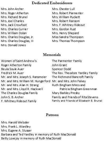“It was a lovely thing to see the names of those who created the needlework—such lovely people, such worthy members of St. Andrew’s—and seeing their names made me realize how fortunate I was to have been a priest with them and so many others at that time. How they must be rejoicing with you all, “upon another shore and in a greater light,” as they witness the long-lastingness of their work and love with which you all have preserved it for certainly another 50 years to come.”